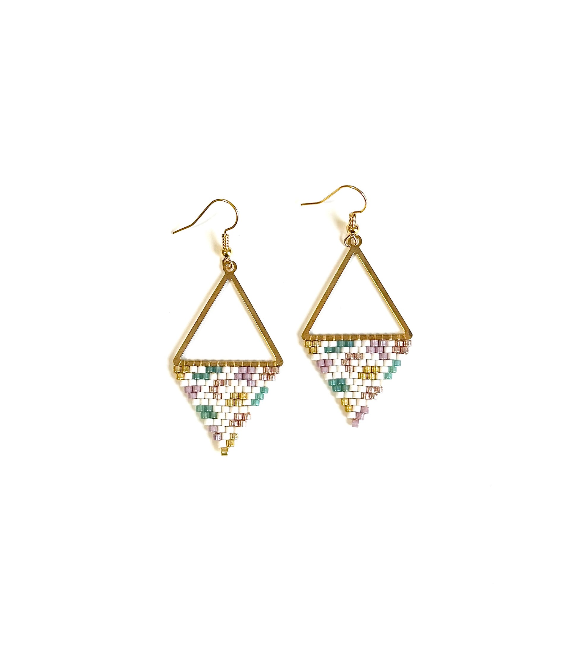 Ces boucles d'oreilles sont composées de perles de verre aux couleurs variées, qui rappelle le style du terrazzo. Chaque perle est minutieusement tissée à la main. Un petit triangle en laiton complète le design. Les crochets en acier inoxydable hypoallergénique assurent un confort optimal.